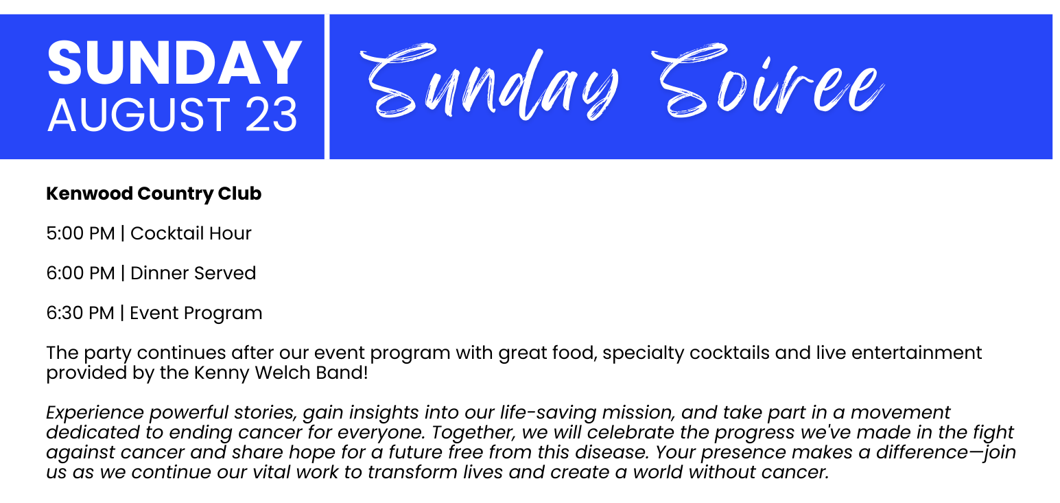 For information on purchasing standalone tickets, additional tickets, or tables to the Sunday Soiree, please contact Melanie at [email protected].